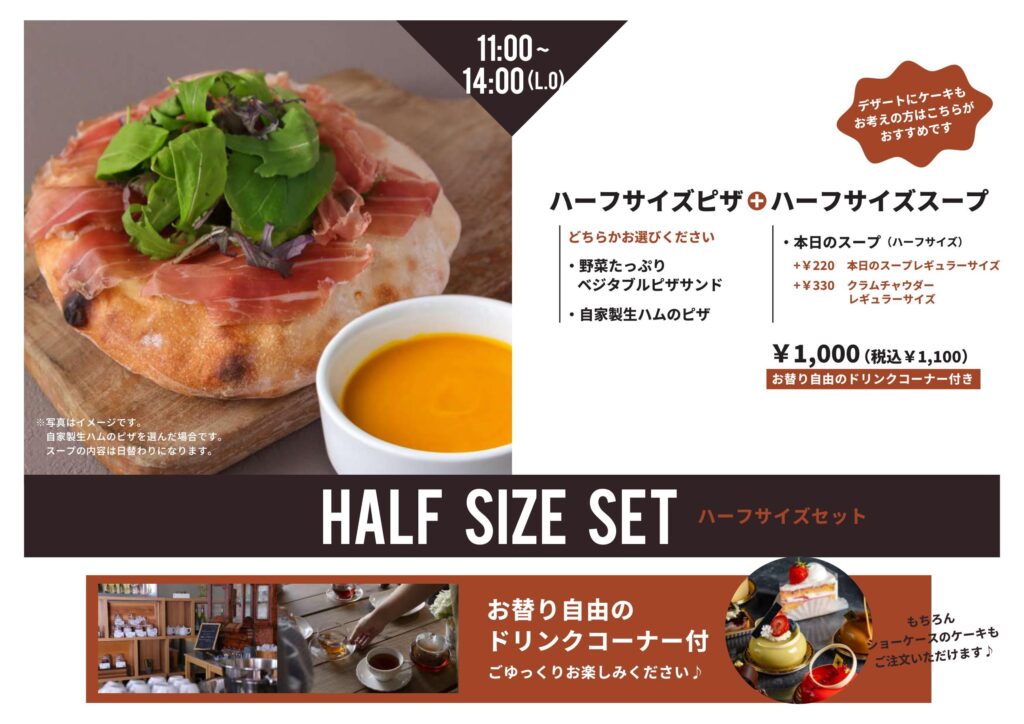 ハーフサイズのピザとスープ、ドリンクコーナーが付いたハーフセットもできました。